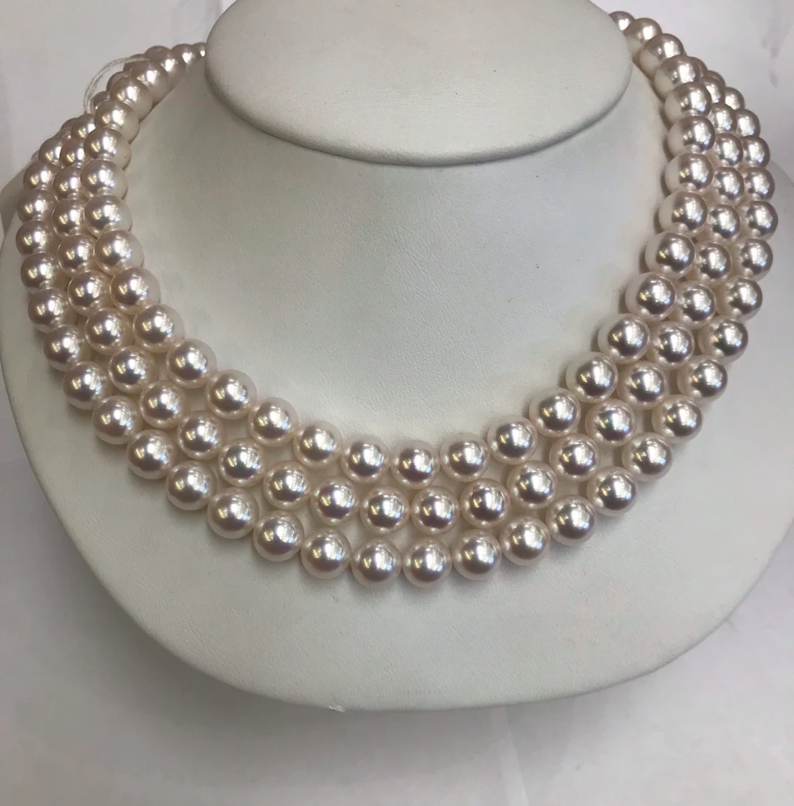 High Quality 8mm High Luster Akoya Pearls Great Color Untarnished 16.5" 17.5" and 18.5" Three Strands 3, 14k Gold Nesting Clasps