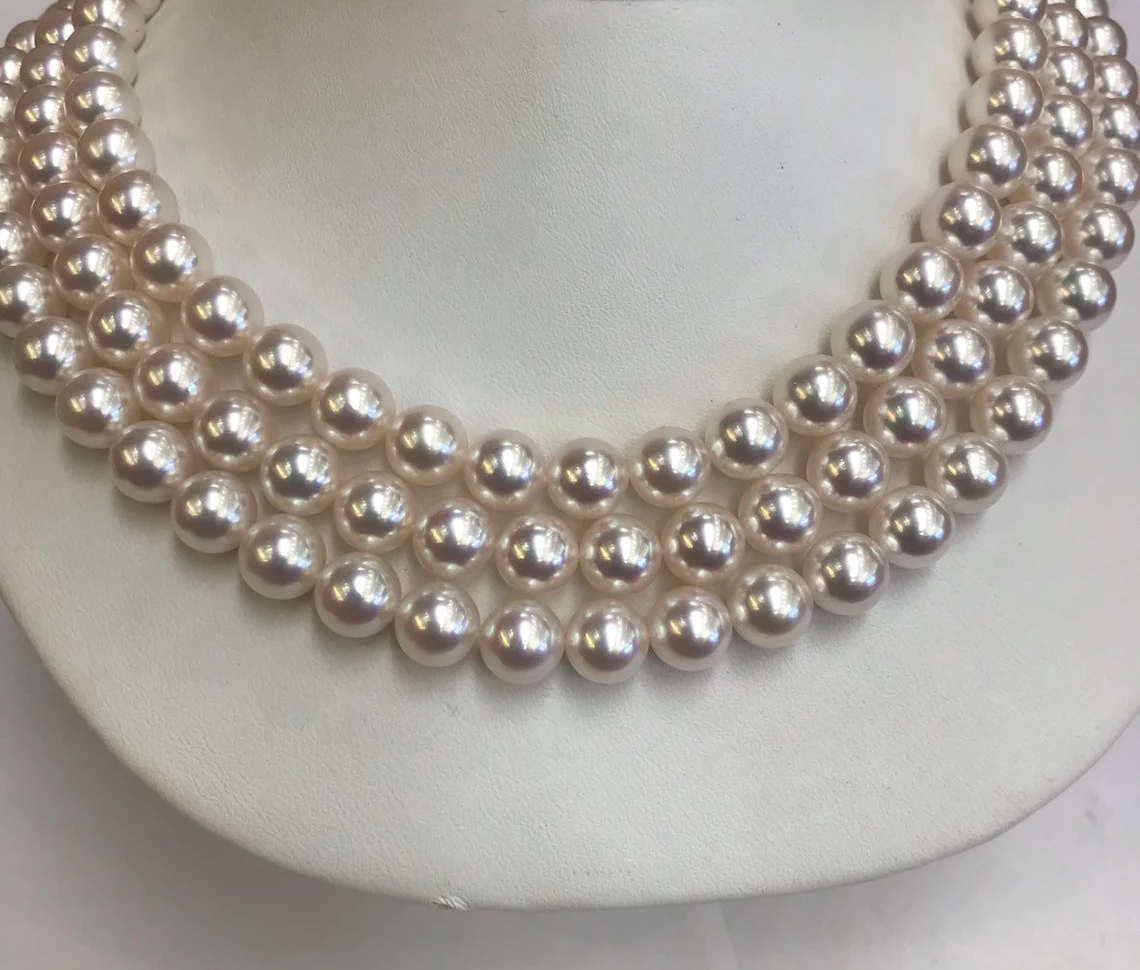 3 Strands 7.5x8mm Japanese Akoya Cultured Pearls. 16.5" 17.5" and 18.5". 3. 14k Gold Clasp. Great Luster. And Color. Flawless. AA Quality.