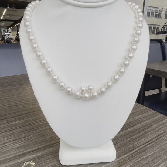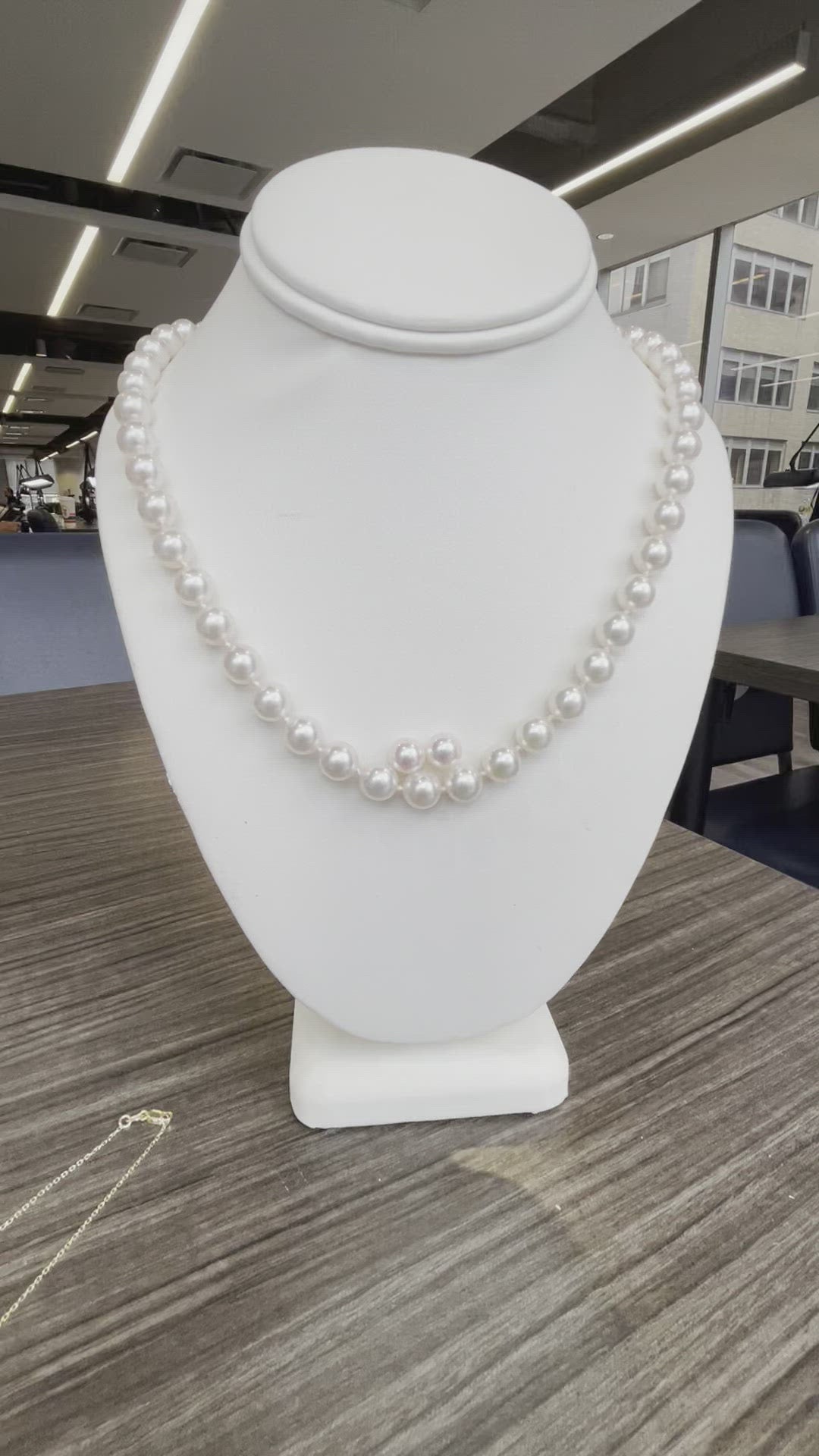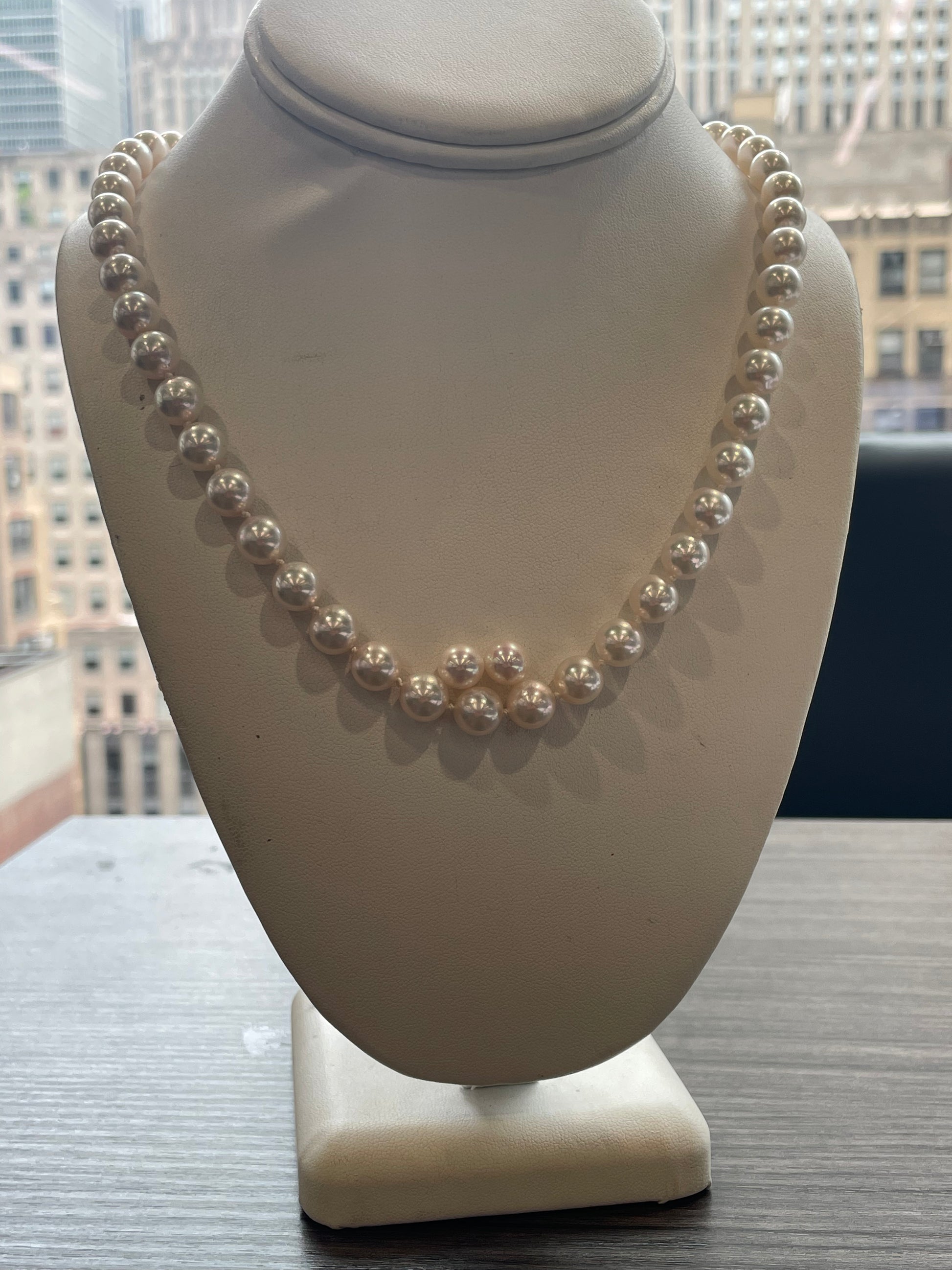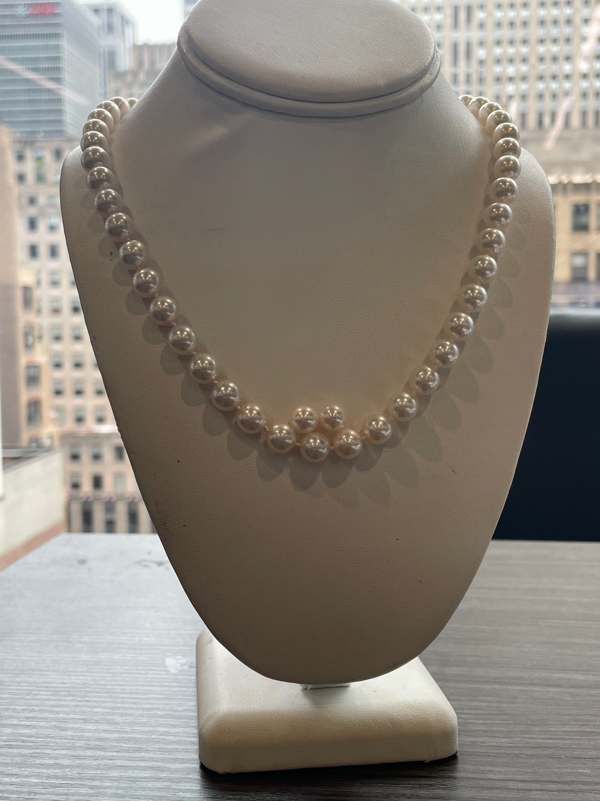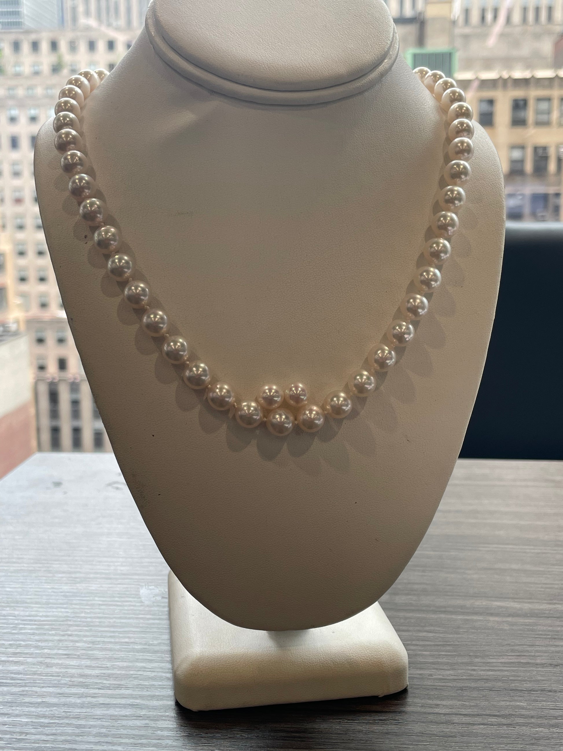 9mm Akoya Pearls 17” with a 14k Gold Ball Clasp. Very Good Luster. Matching 8.5mm Earrings
