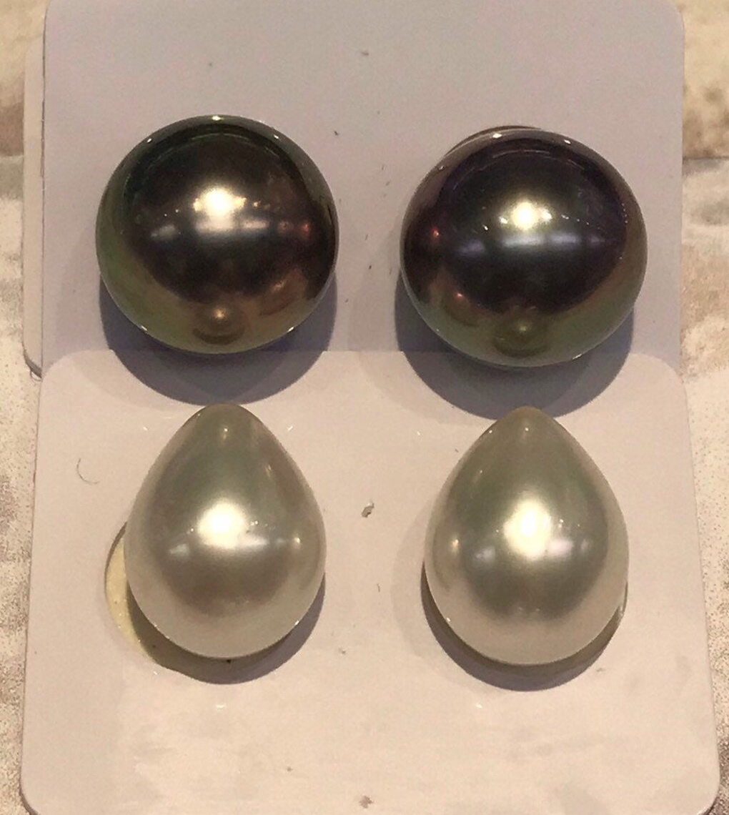 South Sea pearl earrings. 14k gold clip on earrings. Caps are 14.4mm. Very high luster. Round. And great colour. Drop Shapes is a very rare Perfect Drop Shapes are rarer. Removable drop.