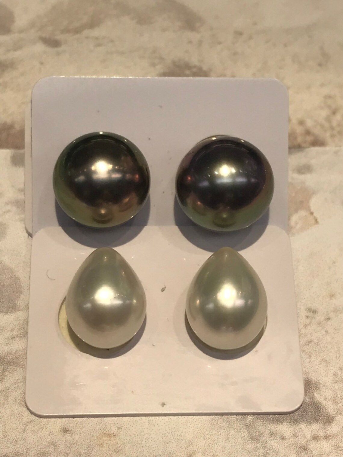 South Sea Pearl Earrings 14.4mm round pearls on top 14.9x11.8mm drop shape pearls