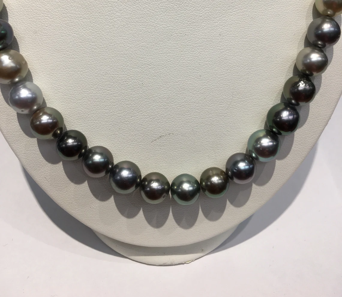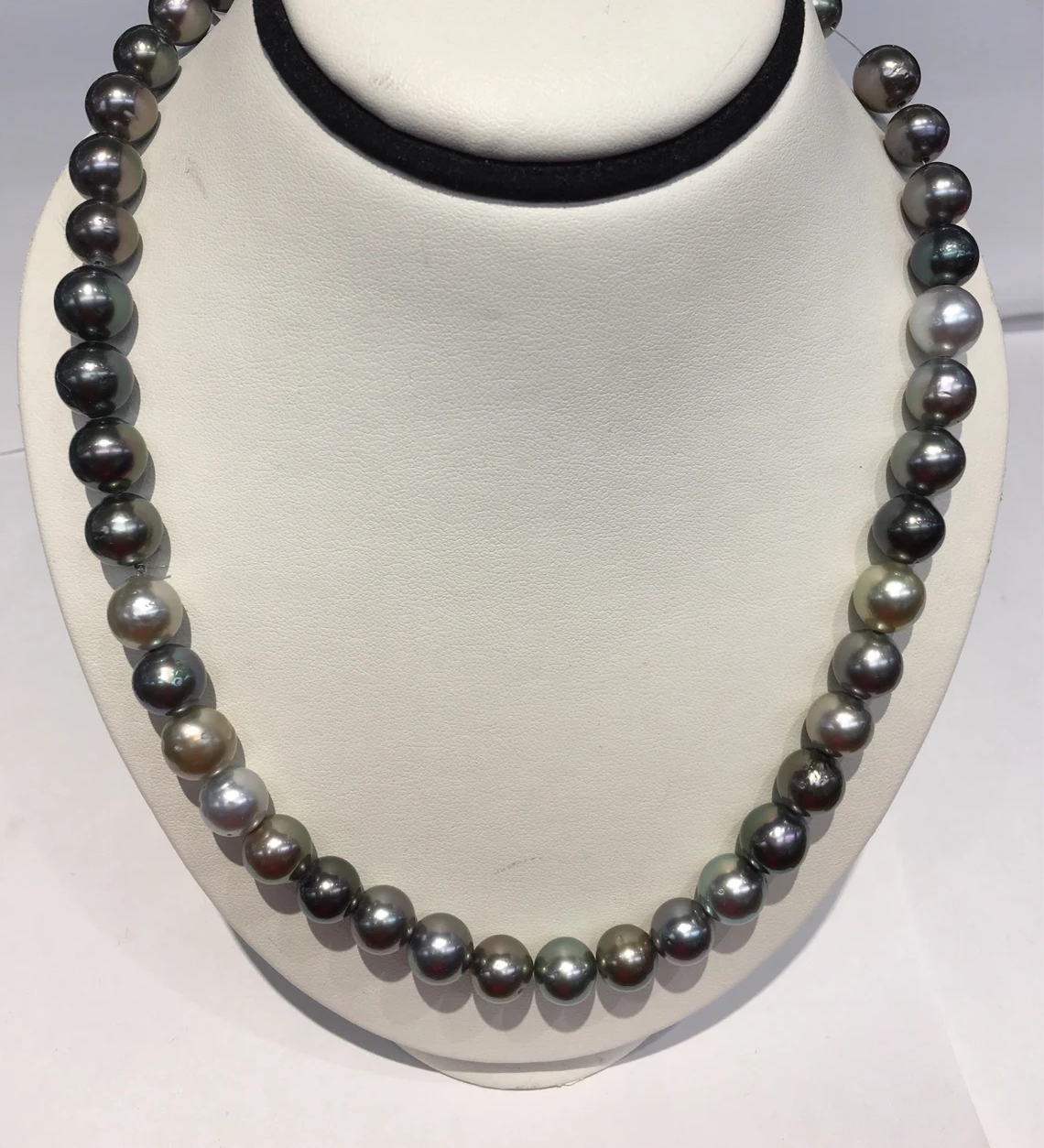 Multicolored South Sea Pearls from Tahiti. Great shine. Round. 17.5". 14k gold clasp.